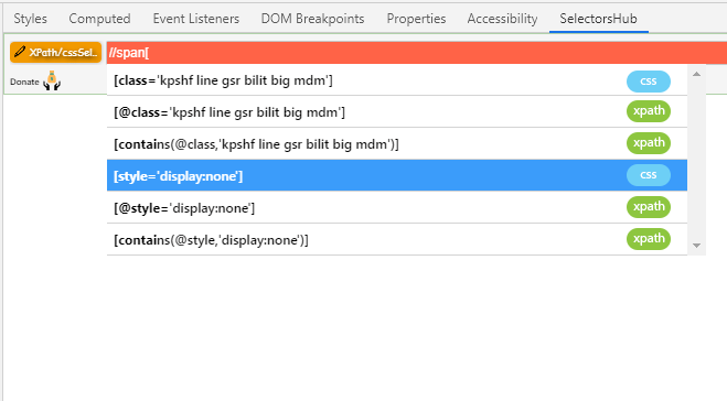 One of the best things about SelectorsHub are the auto-suggestions that are given when a query is being written. They’re quick and handy ways of locating the element you’ve currently got selected.